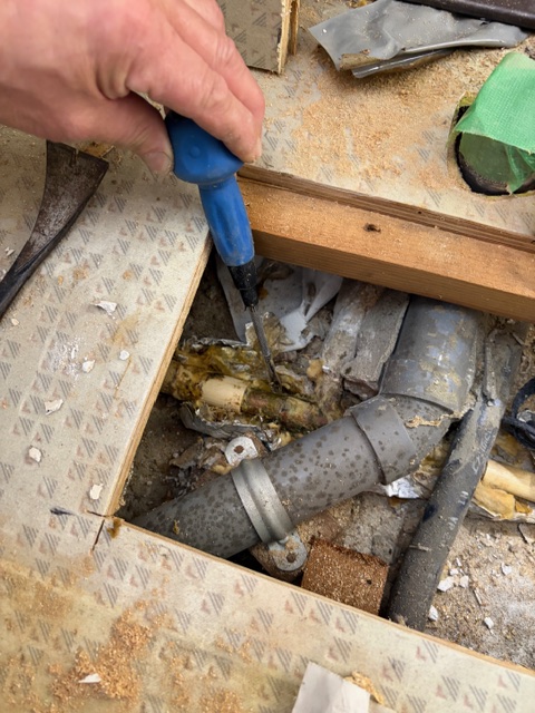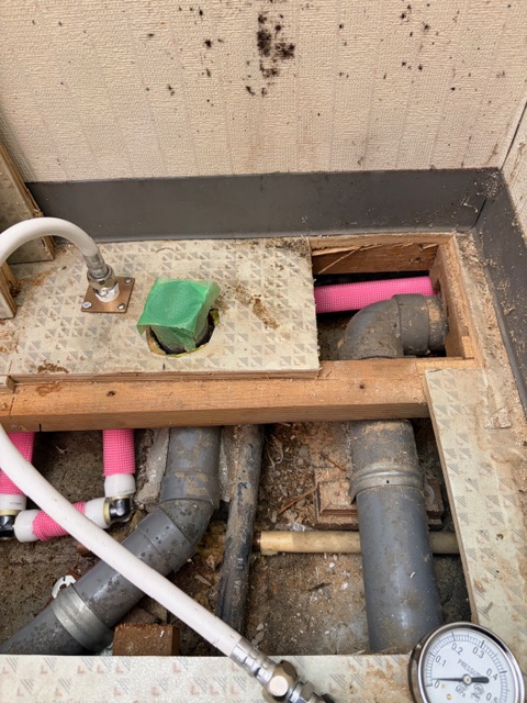 「床を全部壊さないと直せないの?」と不安に思われる方も多いですが、今回は必要最小限の開口だけで修理が可能でした。